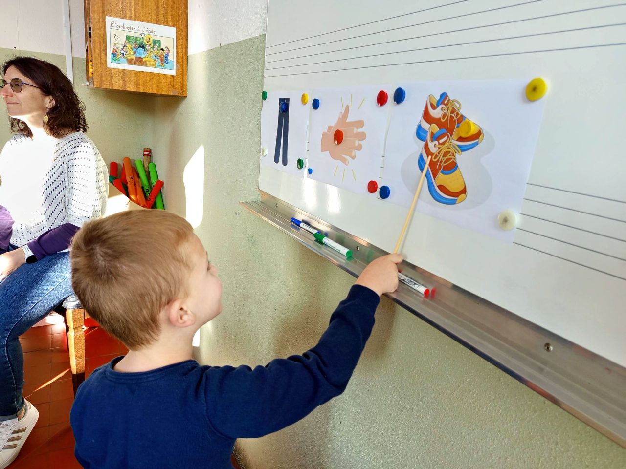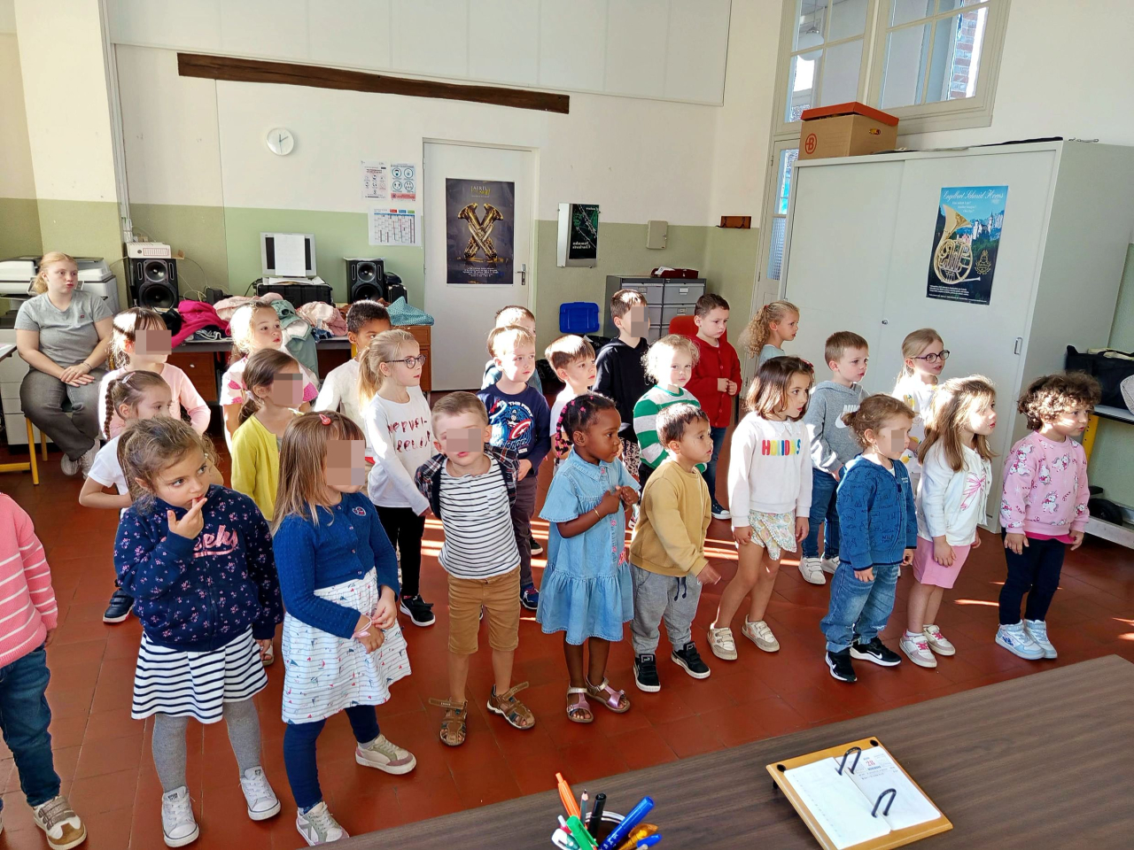 Grâce à la mairie d'Illiers, les quatre plus grandes classes de l'école bénéficient de 12 séances de musique/ an à l'école de musique. En cette première période, les CM1-CM2 et les MS-GS s'y rendent chaque vendredi matin. Mireille Vinot leur propose des séances comportant un temps d'écoute musicale, l'apprentissage de chants et un travail de rythme.