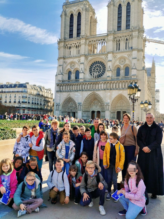 Mardi 7 octobre, les 20 élèves de CE2, CM1 et CM2 participant aux cours de catéchisme avaient RDV à la gare d'Illiers pour prendre le train en direction de Paris. Arrivés à la gare Montparnasse, nous avons admiré la tour Montparnasse, la plus grande tour de Paris, puis nous avons pris le métro pour rejoindre la cathédrale Notre Dame de Paris. L'abbé Roder, désormais prêtre à Paris, a eu la gentillesse de nous servir de guide en nous racontant plein d'anecdotes sur la cathédrale....